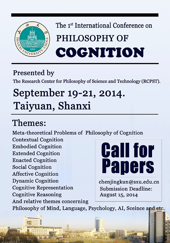 The 1st International Conference on Philosophy of Cognition will be held in Taiyuan, Shanxi, during September 19-21, 2014. The conference, hosted by the Research Center for Philosophy of Science and Technology at Shanxi University, will devote to foundational issues raised by the phenomena of cognition, including various theories of cognition, such as the meta-theoretical reflections, contextual cognition, embodied cognition, dynamic cognition, extended cognition, social cognition, affective cognition, cognitive representation and etc. The relative themes on philosophy of mind, language, AI, psychology and science are also welcome.